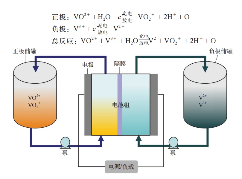 釩電池利用VO2+/VO2+、V2+/V3+兩對氧化還原電堆的釩離子溶液作為正極和負極的活性物質,分別儲存在各自的電解液儲罐中。對電池進行充/放電時,電解液通過泵的作用,由外部儲液罐分別循環流經電池的正極室和負極室,并在電極表面發生氧化和還原反應,實現對電池的充/放電。